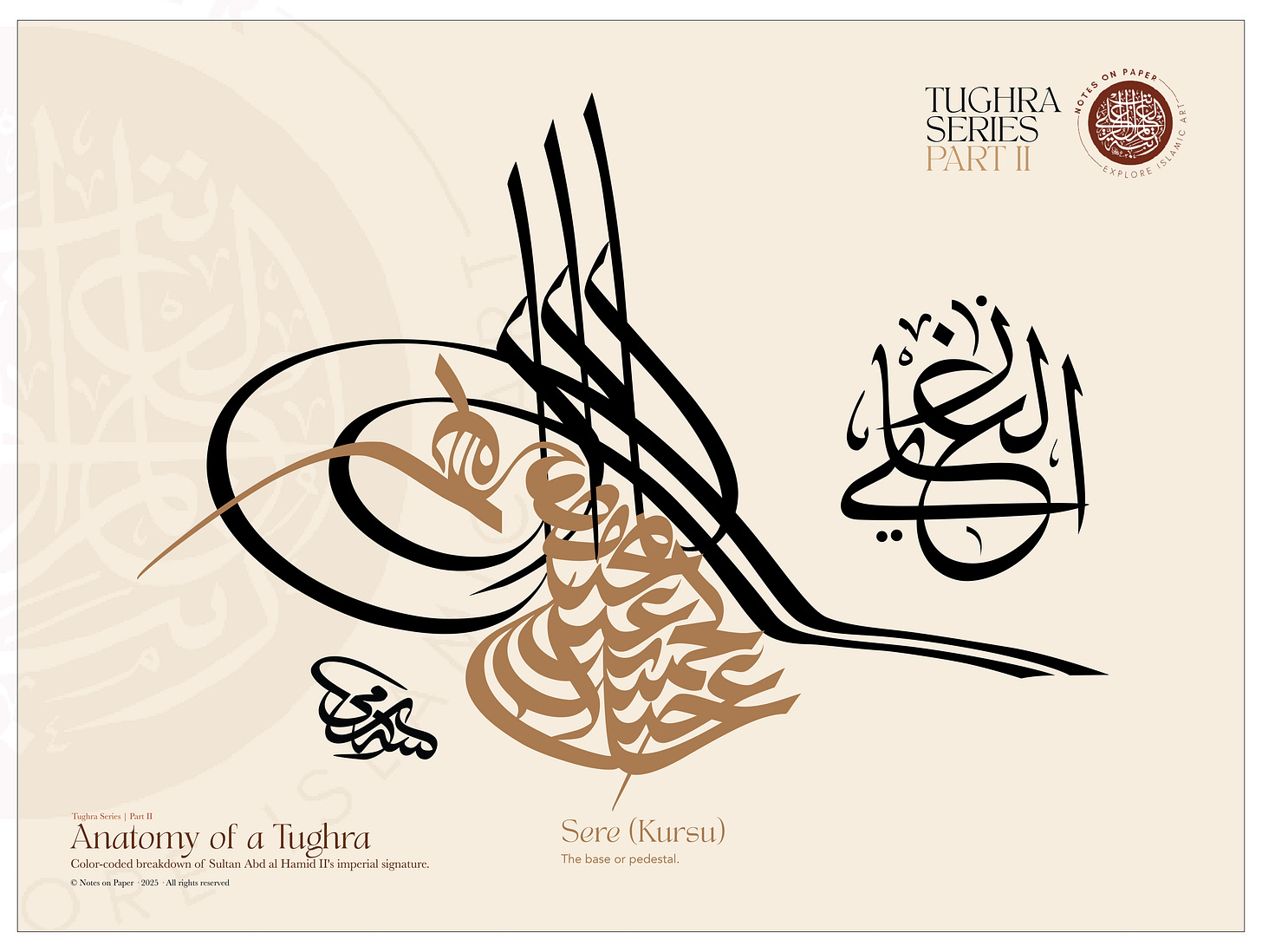 Sere (Kürsü) – This is the solid bottom section of the tughra, like its foundation. In Sultan Abdülhamid II’s tughra, the sere contains his name “ʿAbd al-Ḥamīd Khān,” his father’s name “bin ʿAbd al-Majīd,” and the honorific phrase al-muẓaffar dāʾiman("ever victorious"). Though the shape evolved — from straight lines to more triangular or talon-like forms — its function remained the same: it’s where the sultan’s full titulature is laid out.
