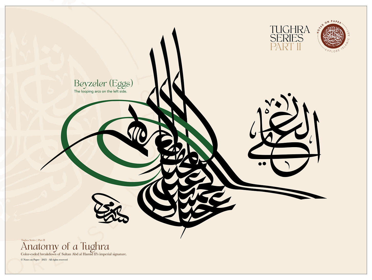 Beyzeler (Eggs) – The looping arcs on the left side. Beyze comes from the Arabic word for “egg.” In a tughra, it refers to the two large oval loops that swell to the left of the design. These are formed by the sweeping tail of certain letters – specifically the curled “n” (nun) in words like bin and han. In most tughras you’ll see two concentric oval loops, one inside the other, creating a distinctive double curve. Some sources poetically interpret the beyzeler as symbols of the empire’s reach – for instance, one 19th-century commentary fancifully suggested the larger loop represented the Mediterranean Sea and the smaller loop the Black Sea under the sultan’s dominion. Whether or not the Ottomans themselves intended that meaning is unclear, but it’s a charming interpretation! In any case, the beyzeler give the tughra much of its visual bulk on the left. (They were so emblematic that in Ottoman slang, people even called a certain style of calligraphic decoration “beyze” because it looked like these loops.)