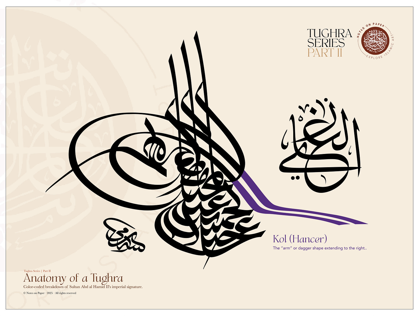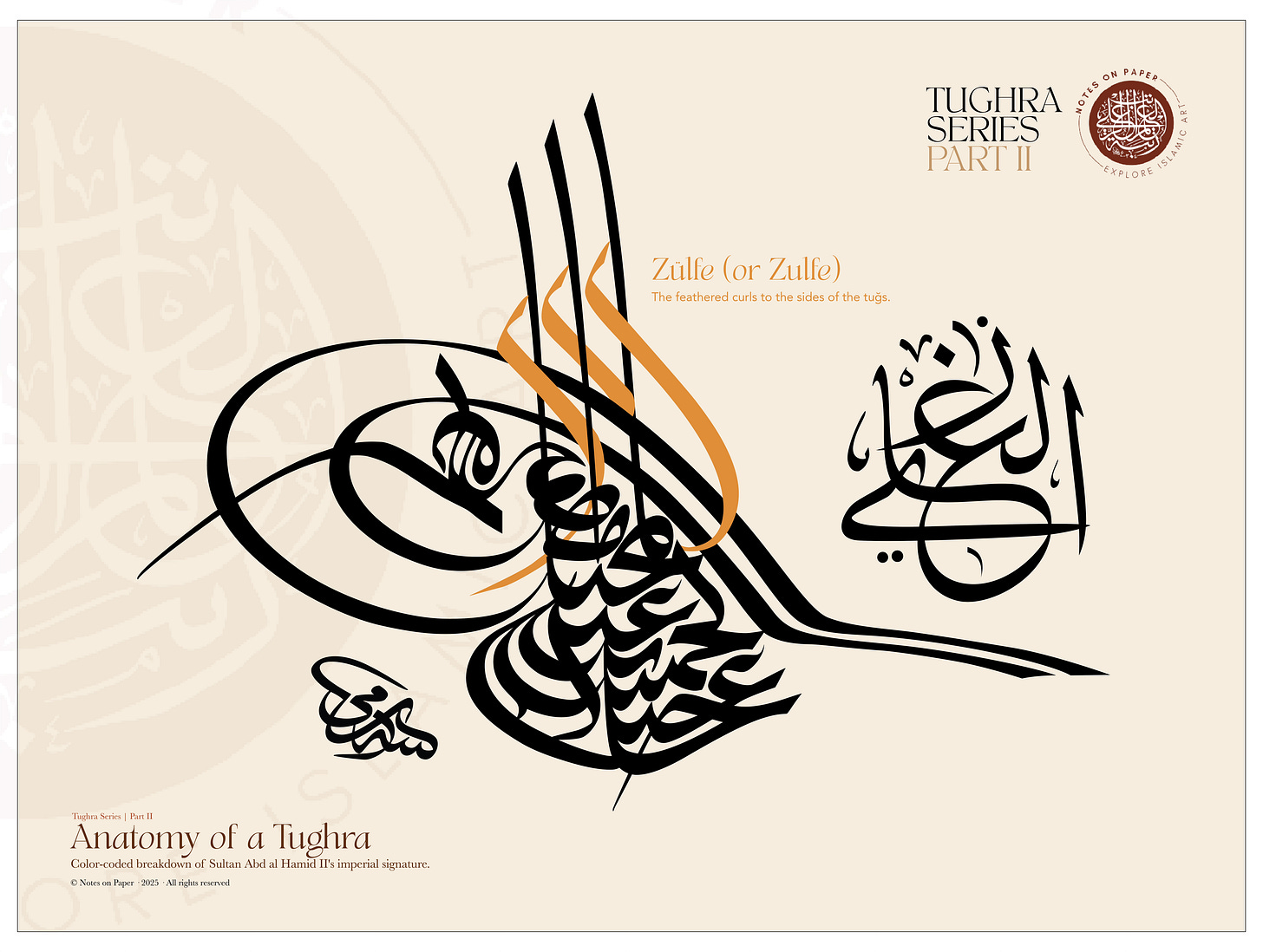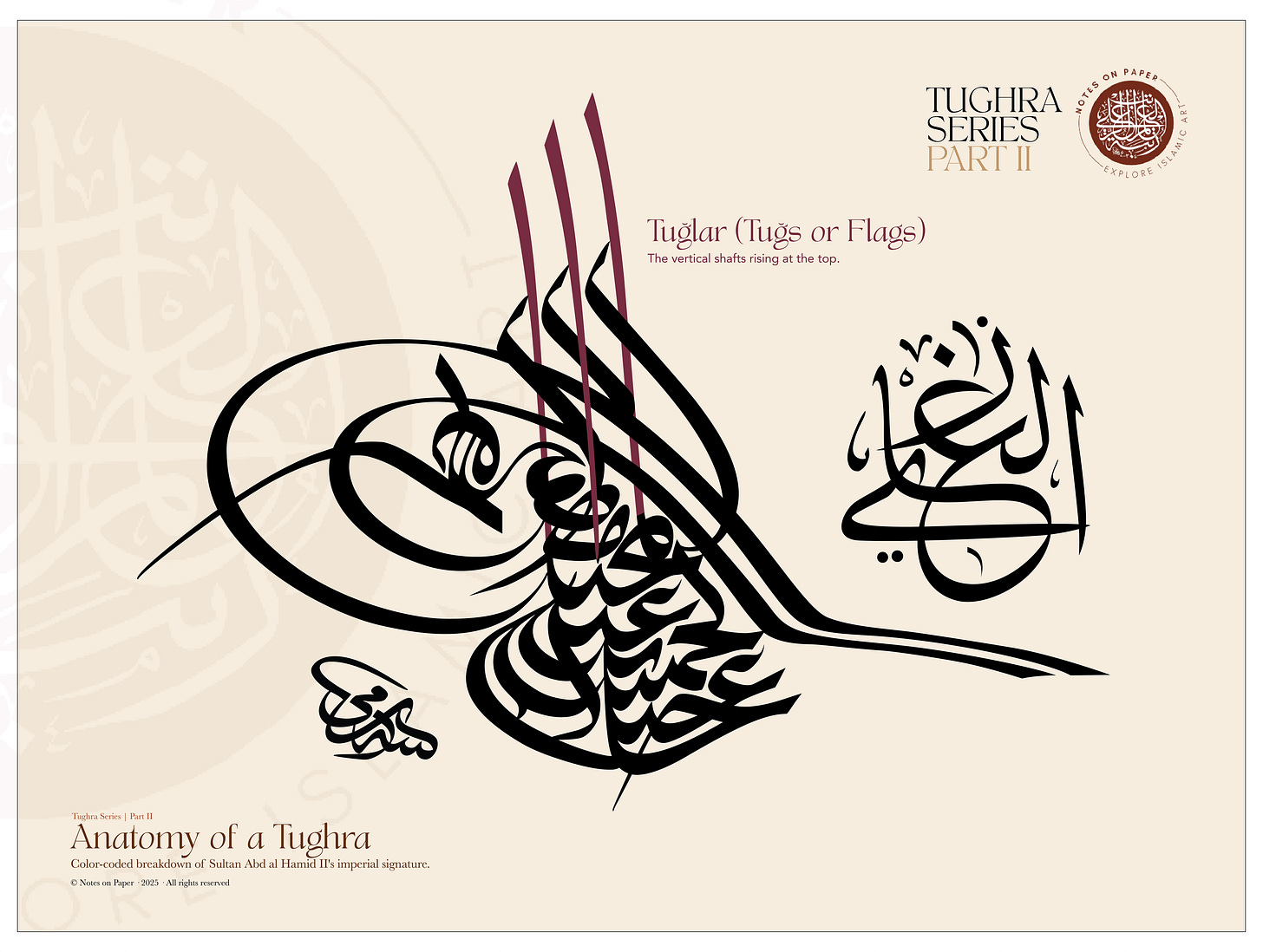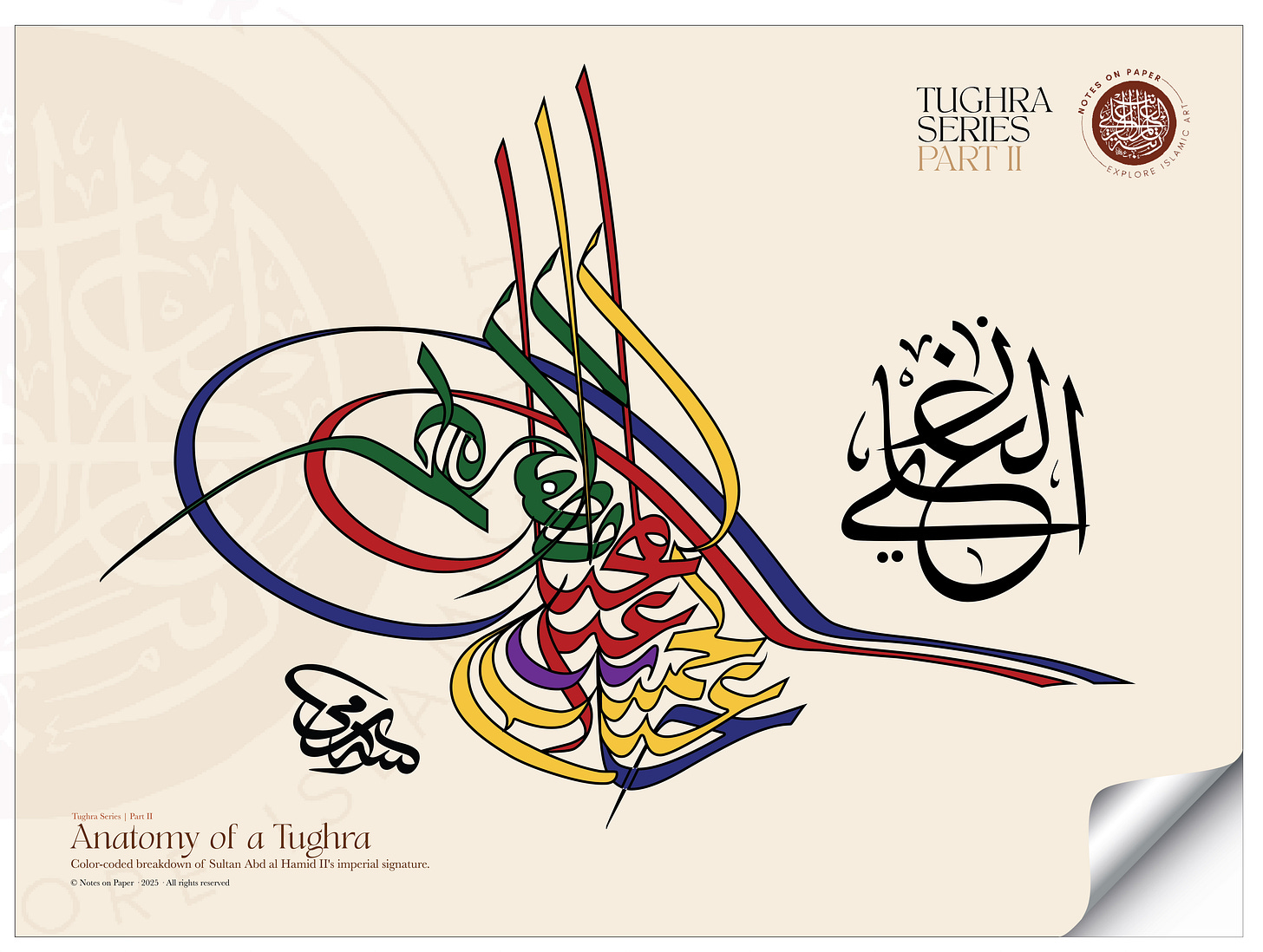 In this second installment, we’ll take a closer look at the anatomy of a tughra using the imperial monogram of Sultan Abdülhamid II as our guide. What are its essential parts? What do they symbolize? And how did master calligraphers manage to fit each sultan’s identity into this intricate yet standardized design? Let’s break it down — stroke by stroke.